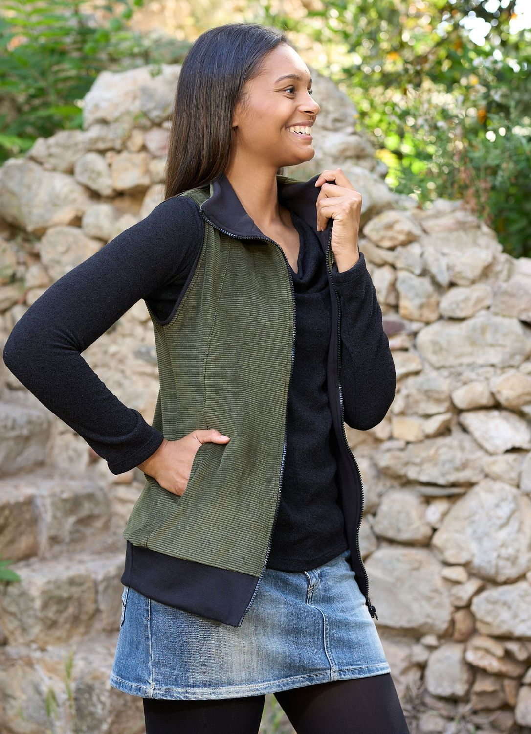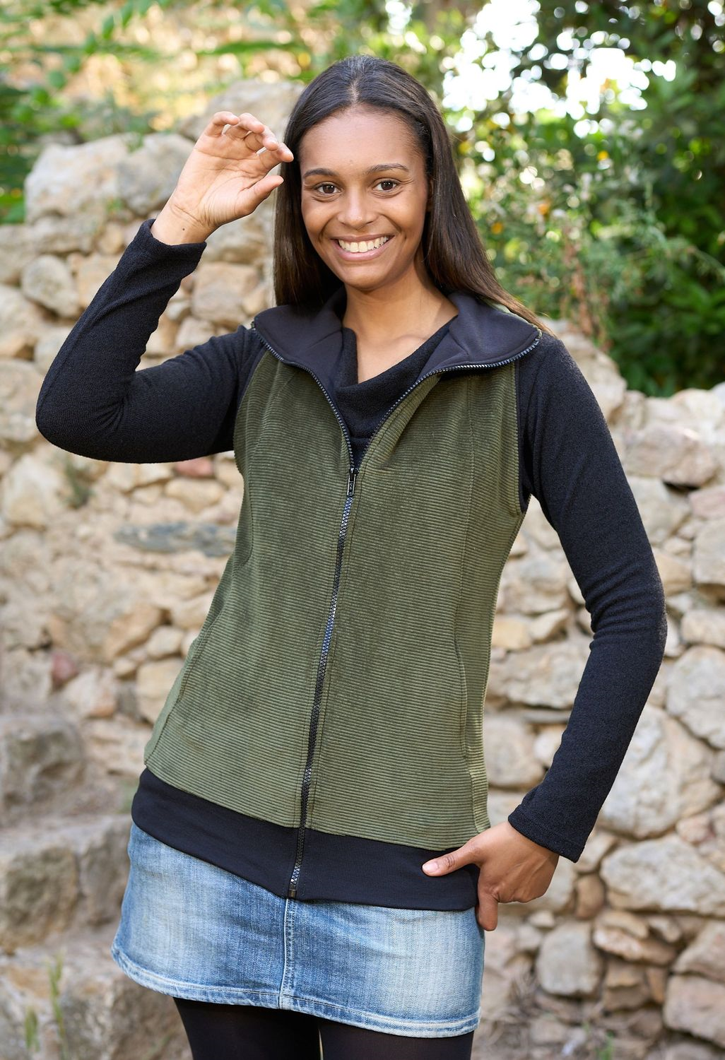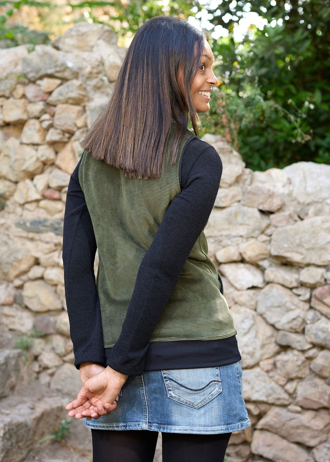 Armilla de pana color verd caqui amb elasticitat i interior afelpat, una peça molt còmoda, suau i agradable de portar. El teixit de pana amb un toc elàstic permet que s’adapti bé al cos i ofereixi llibertat de moviment, ideal per al dia a dia.